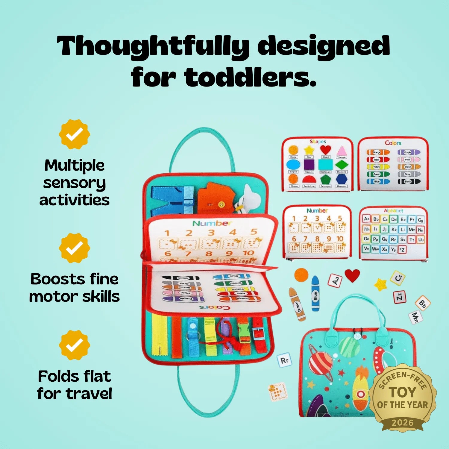 The busy board measures28 × 25 cm (≈11 × 9.8 inches)and weighs just0.77 lbs (0.35 kg). It’s lightweight, slim, and designed to fit easily into most diaper bags or school bags — making it the perfect travel companion for road trips, flights, or everyday outings.