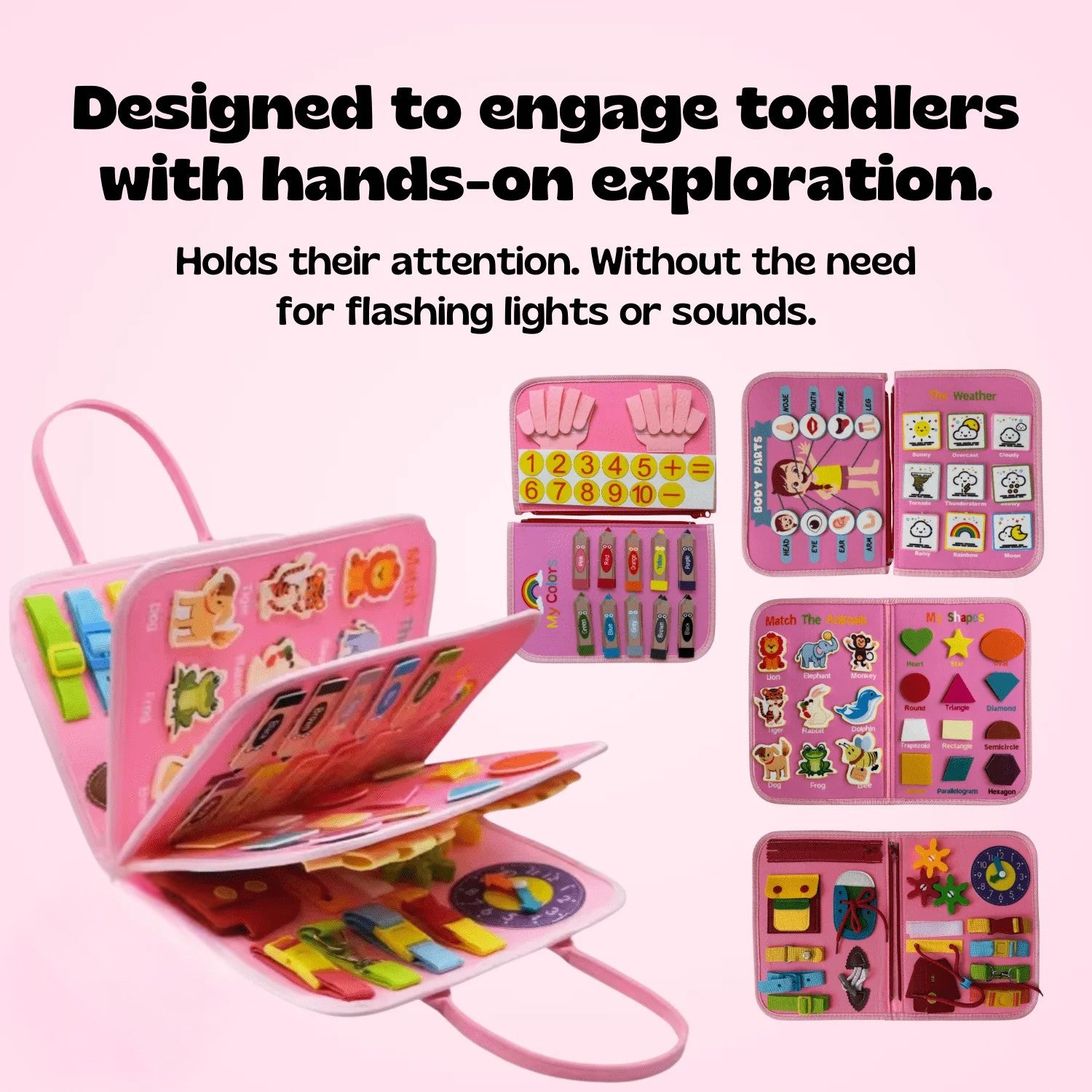 Built with real zippers, buckles, buttons, and laces, this interactive activity board keeps small hands engaged and curious for 30+ minutes at a time.