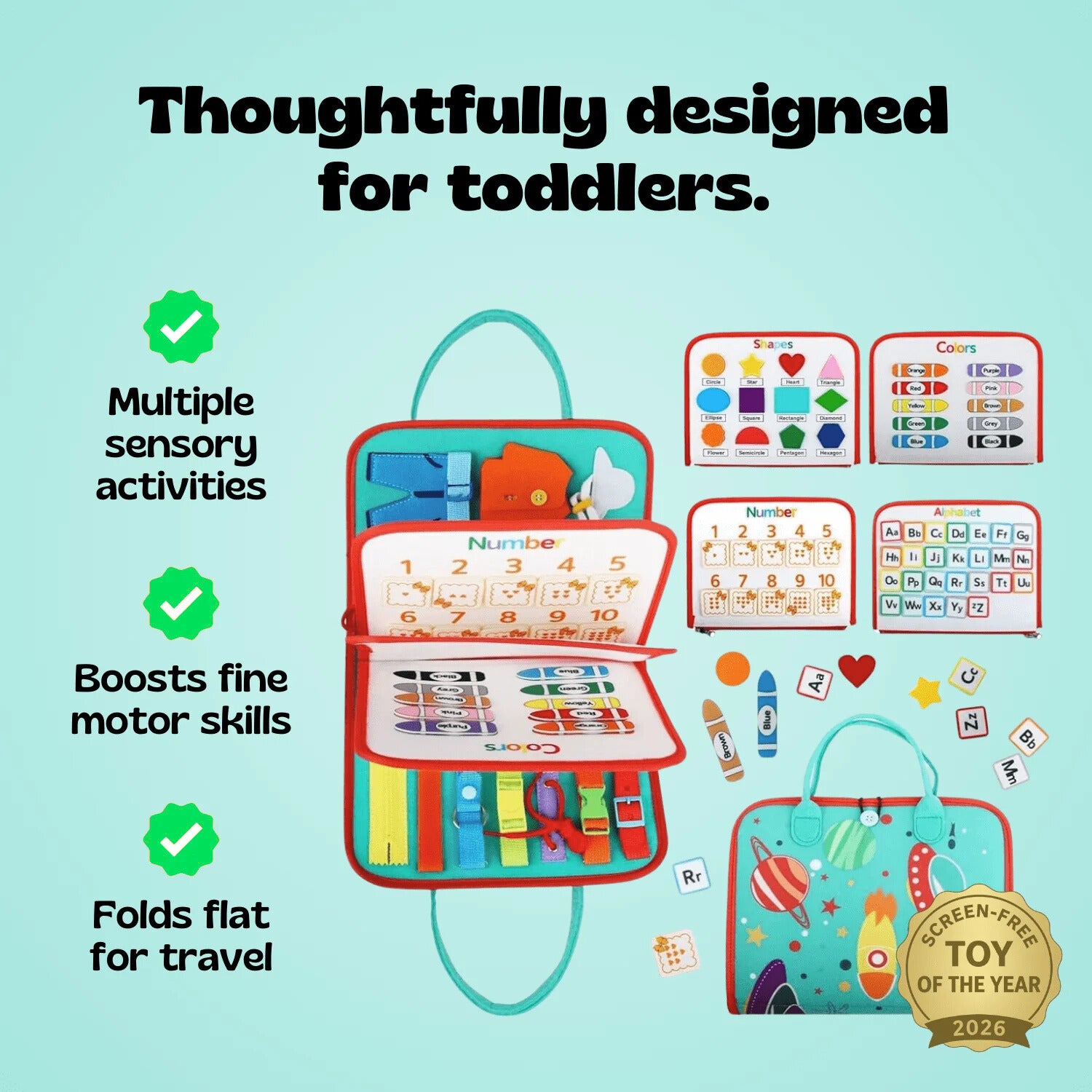 No screens, no batteries, no guilt. 30+ real-world activities (zippers, buckles, buttons) that build actual skills while you get the peace you need.
